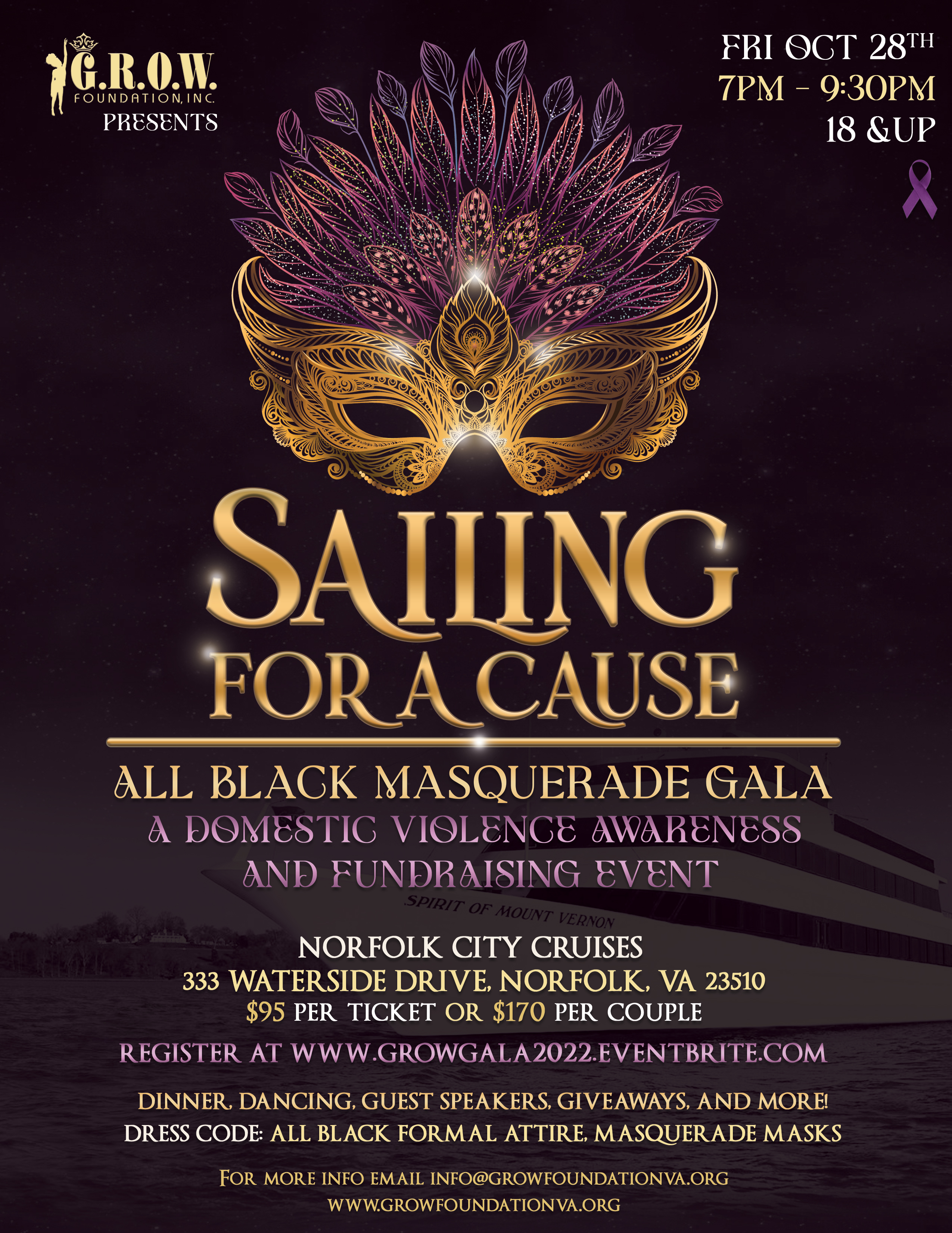 You are cordially invited to G.R.O.W. Foundation's inaugural gala, "Sailing for a Cause", an all-black masquerade affair. Grab your best black gown or tux-- and your favorite masquerade mask-- and join us for an unforgettable night of empowering guest speakers, dinner, and dancing for a great cause!
