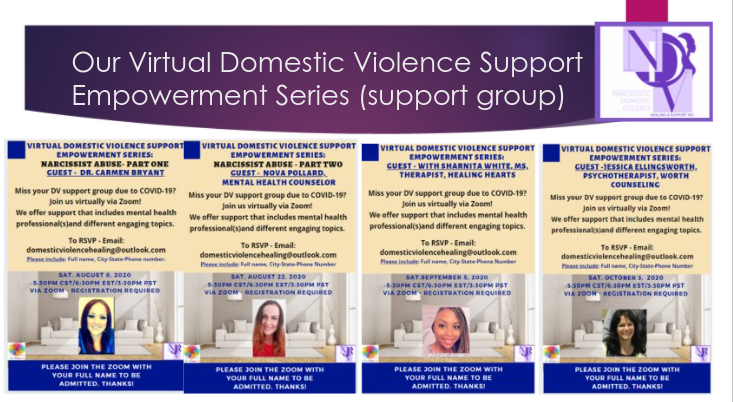 NDV(Narcissistic Domestic Violence)Healing and Support Inc. is a non-profit 501 (c) (3) organization. NDV Healing & Support Inc. services the southeastern Wisconsin area/Lake County, Illinois; however with some of our virtual programs we service a much larger area(nationally/internationally).